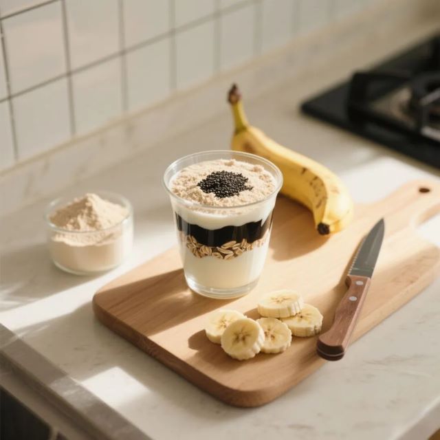 【食材】黑芝麻醬2勺、無糖酸奶150g、即食燕麥30g、香蕉半根、豆?jié){粉1包