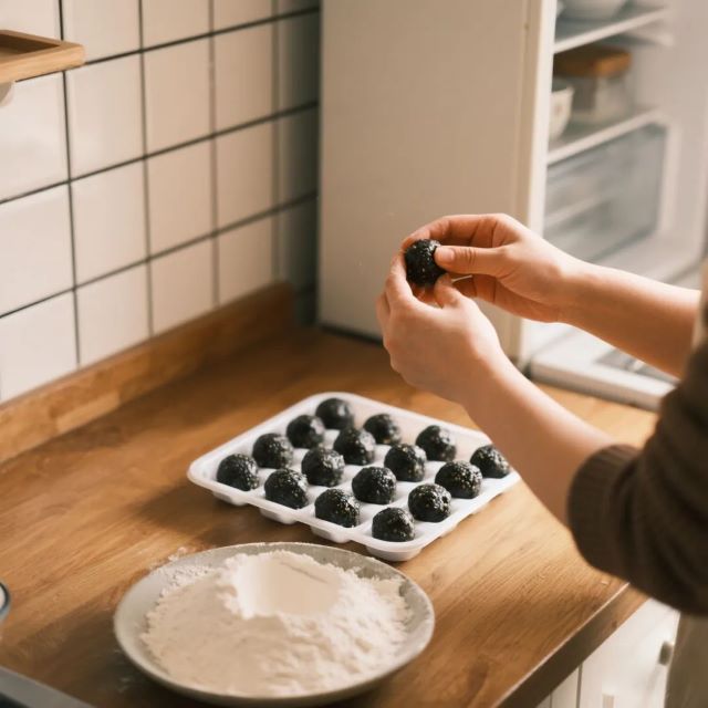① 黑芝麻醬+蜂蜜+椰子油混合,冷凍20分鐘搓成球