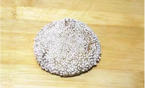 16、把小面團(tuán)收口,一側(cè)粘上白芝麻后壓扁。