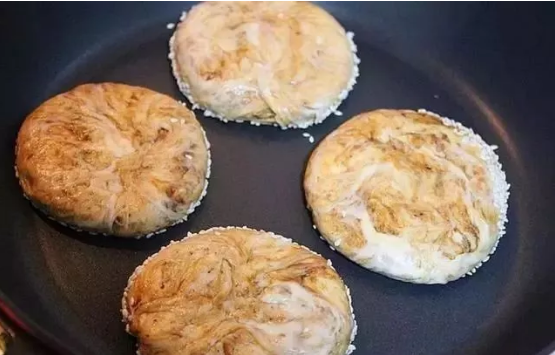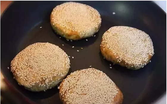 17、把平底鍋或電餅鐺子加熱,再把燒餅有芝麻的一面朝下,放入鍋內(nèi)用小火烙一分鐘左右。