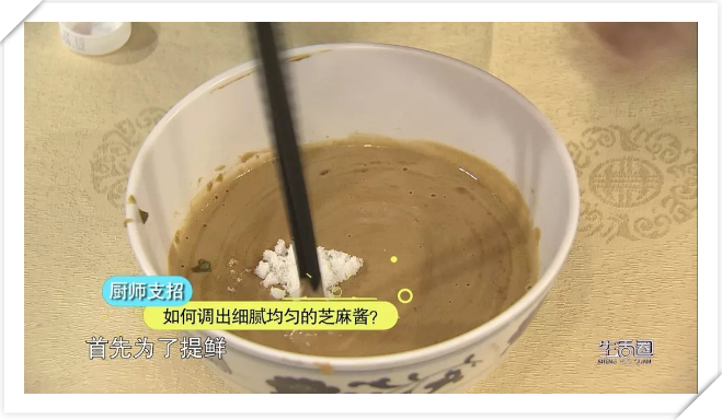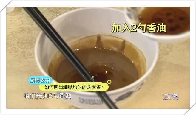 關鍵是要在加水之前先加入適量的香油進行攪拌,這樣可以讓芝麻醬充分軟化,有效避免疙瘩產生。