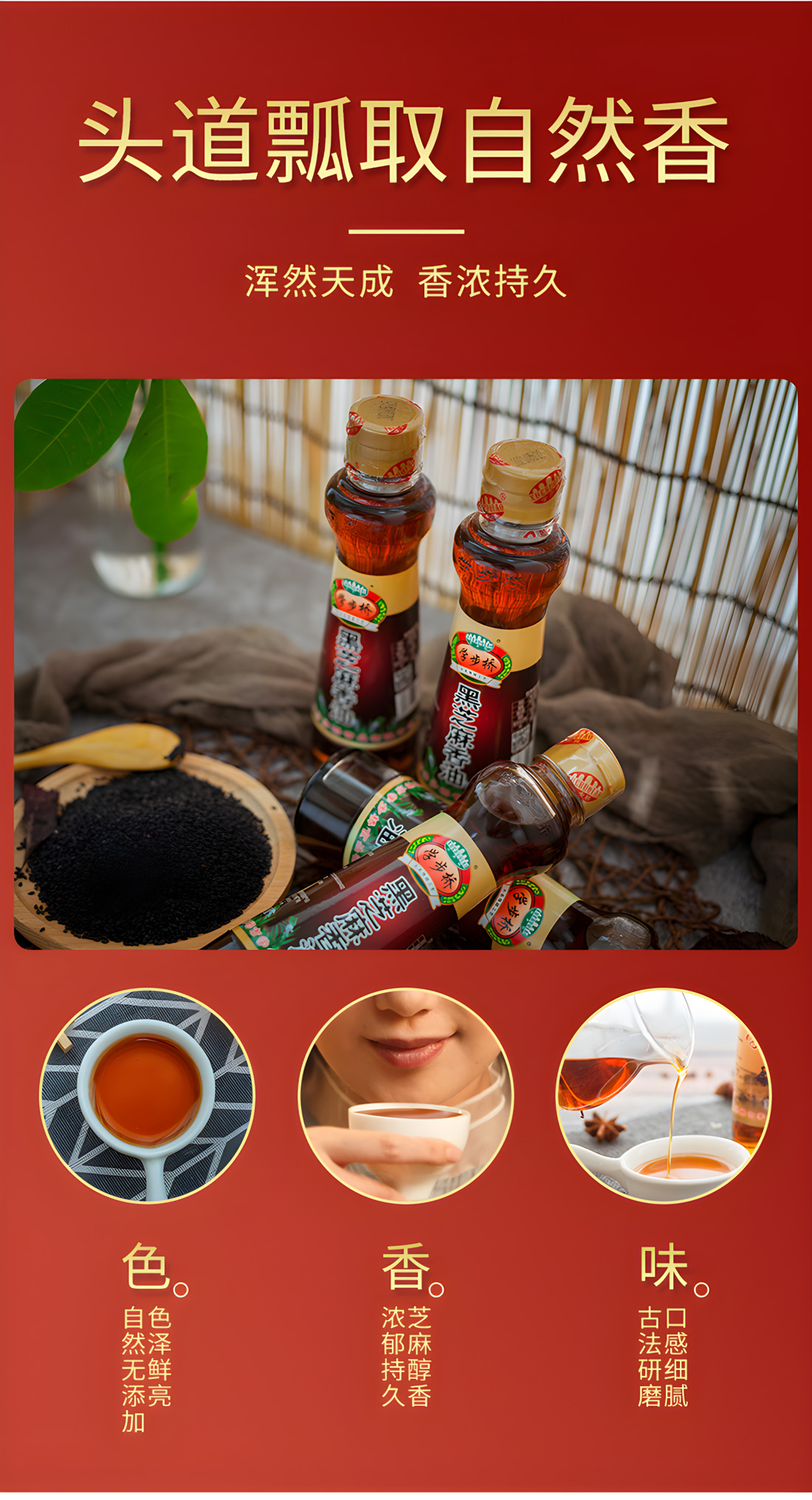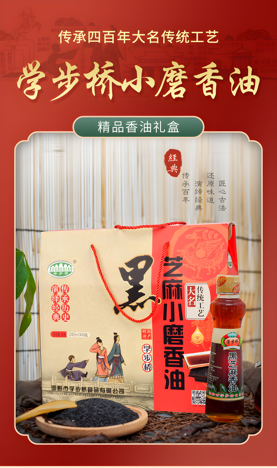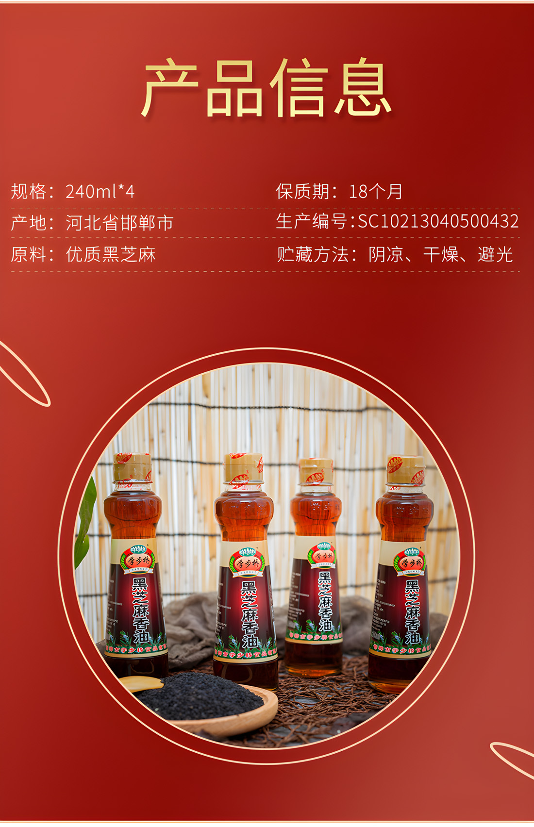 內(nèi)含240ml黑芝麻香油4瓶,黑芝麻香油營養(yǎng)價(jià)值高,做伴手禮更顯珍貴,瓶小而精致,存放更方便,且禮盒大小適中,此禮盒造型獨(dú)特,簡潔大氣,走親訪友,更顯卓爾不凡。