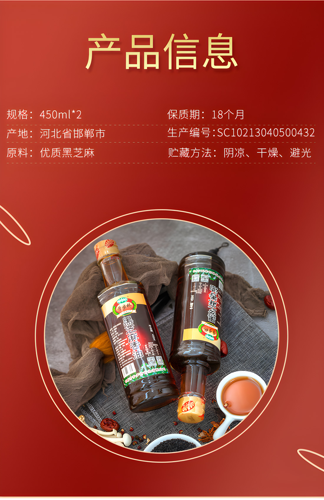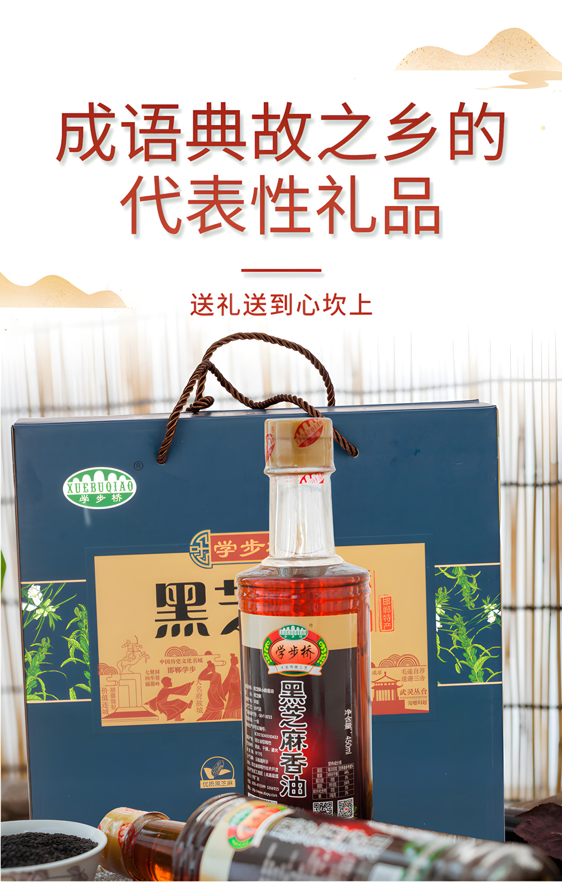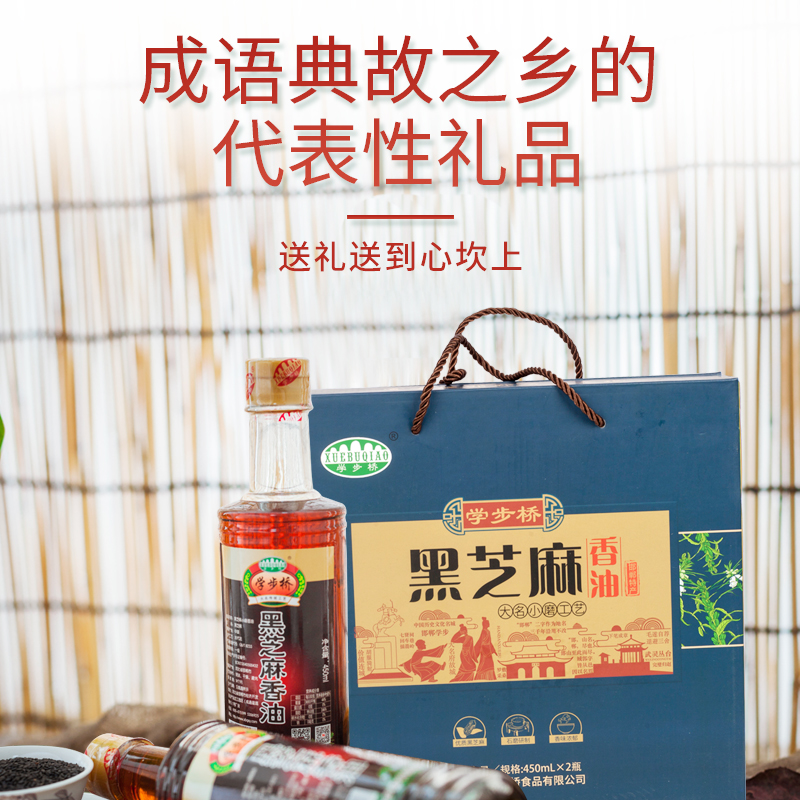 內(nèi)含450ml黑芝麻香油2瓶,黑芝麻香油營養(yǎng)價(jià)值高,做伴手禮更具特色,此禮盒外觀采用藍(lán)黃相間色彩搭配,簡潔大氣,插畫中的成語典故,讓您的親朋好友真正體驗(yàn)“品成語之鄉(xiāng)小磨香油,賞古城邯鄲歷史文化”的意境。