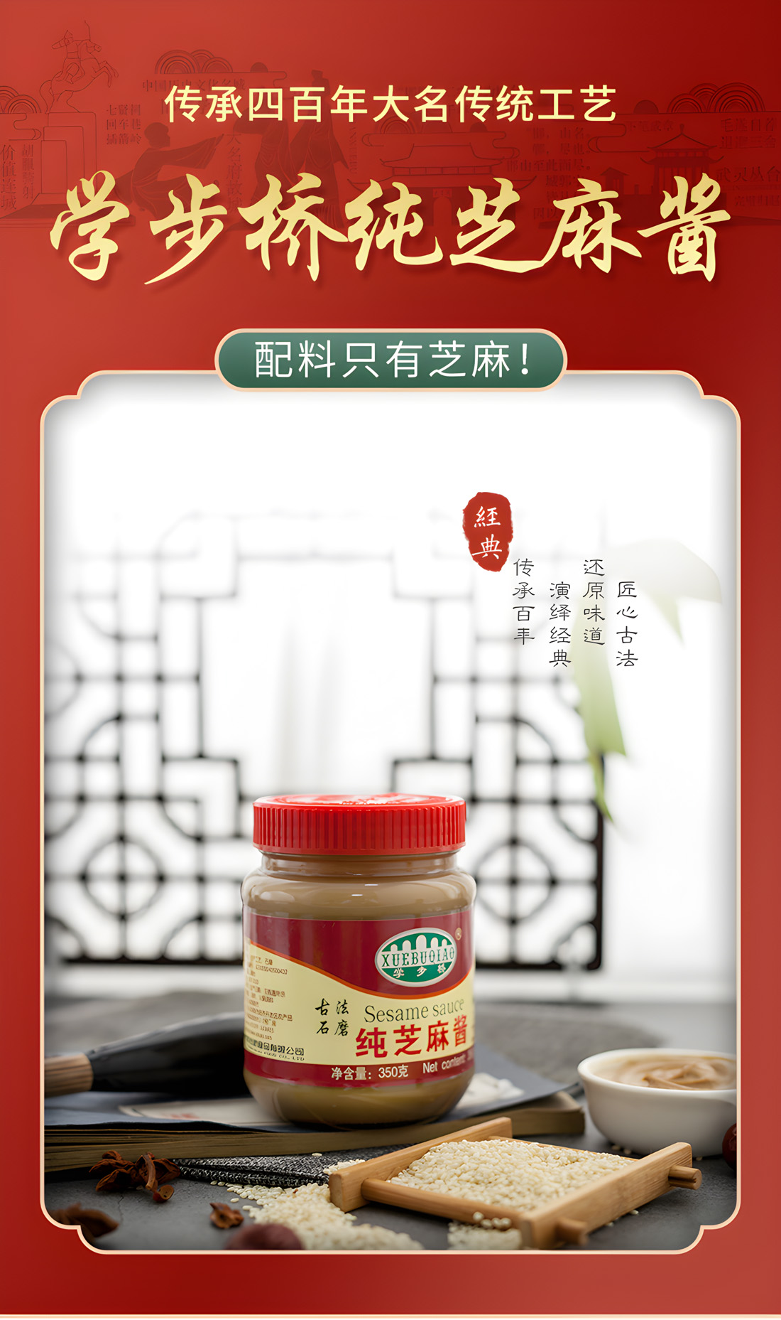 學(xué)步橋純芝麻醬為優(yōu)質(zhì)國(guó)產(chǎn)芝麻研磨,色澤為黃褐色,質(zhì)地細(xì)膩,味美,具有芝麻特有的濃郁香氣,純芝麻醬富含豐富的蛋白質(zhì)、氨基酸及多種維生素和礦物質(zhì),其中含鈣量較高。學(xué)步橋純芝麻醬遇鹽變咸,遇糖變甜,單吃很香,不僅豐富了膳食的風(fēng)味,也提高了膳食的營(yíng)養(yǎng)價(jià)值。麻醬涼面,面香而不膩;火鍋蘸料,口感細(xì)膩;麻醬拌菜,香醇爽滑;一勺芝麻醬,無(wú)須烹飪做出美味佳肴。精致瓶裝,白領(lǐng)、做飯頻率少的家庭更適用。