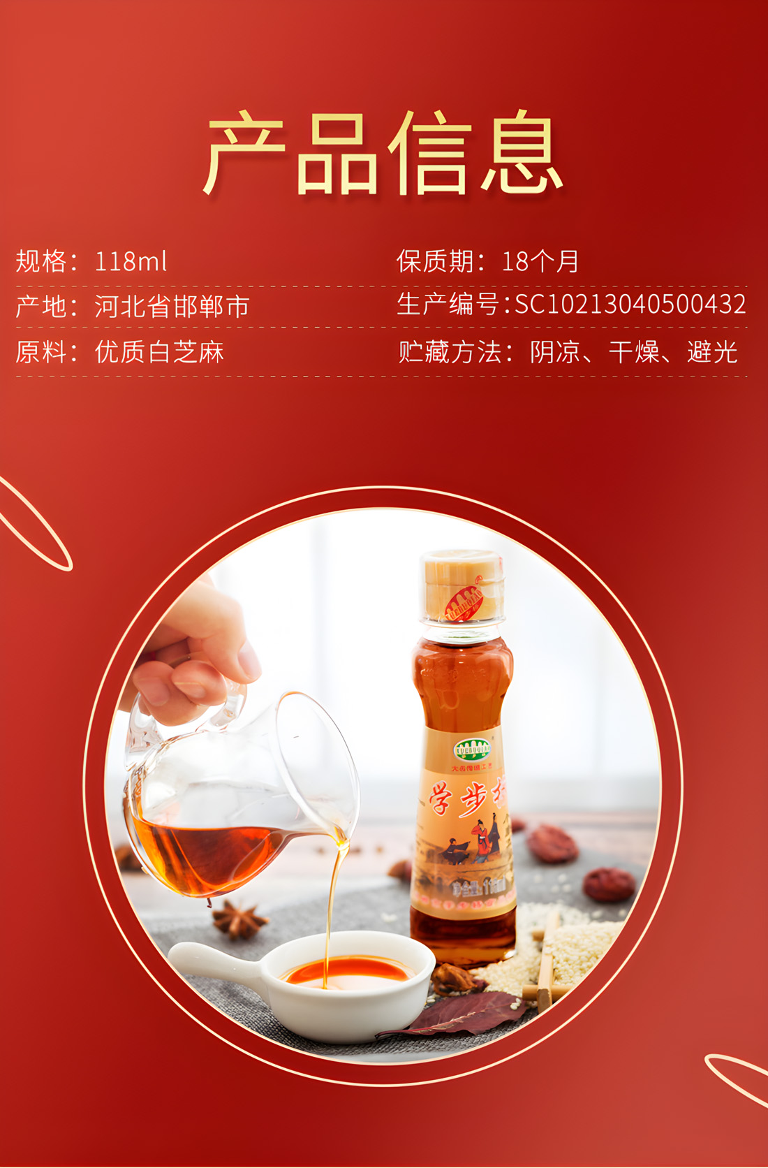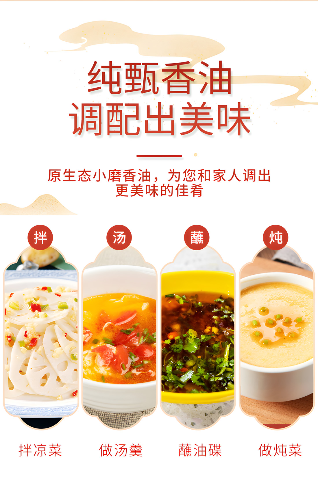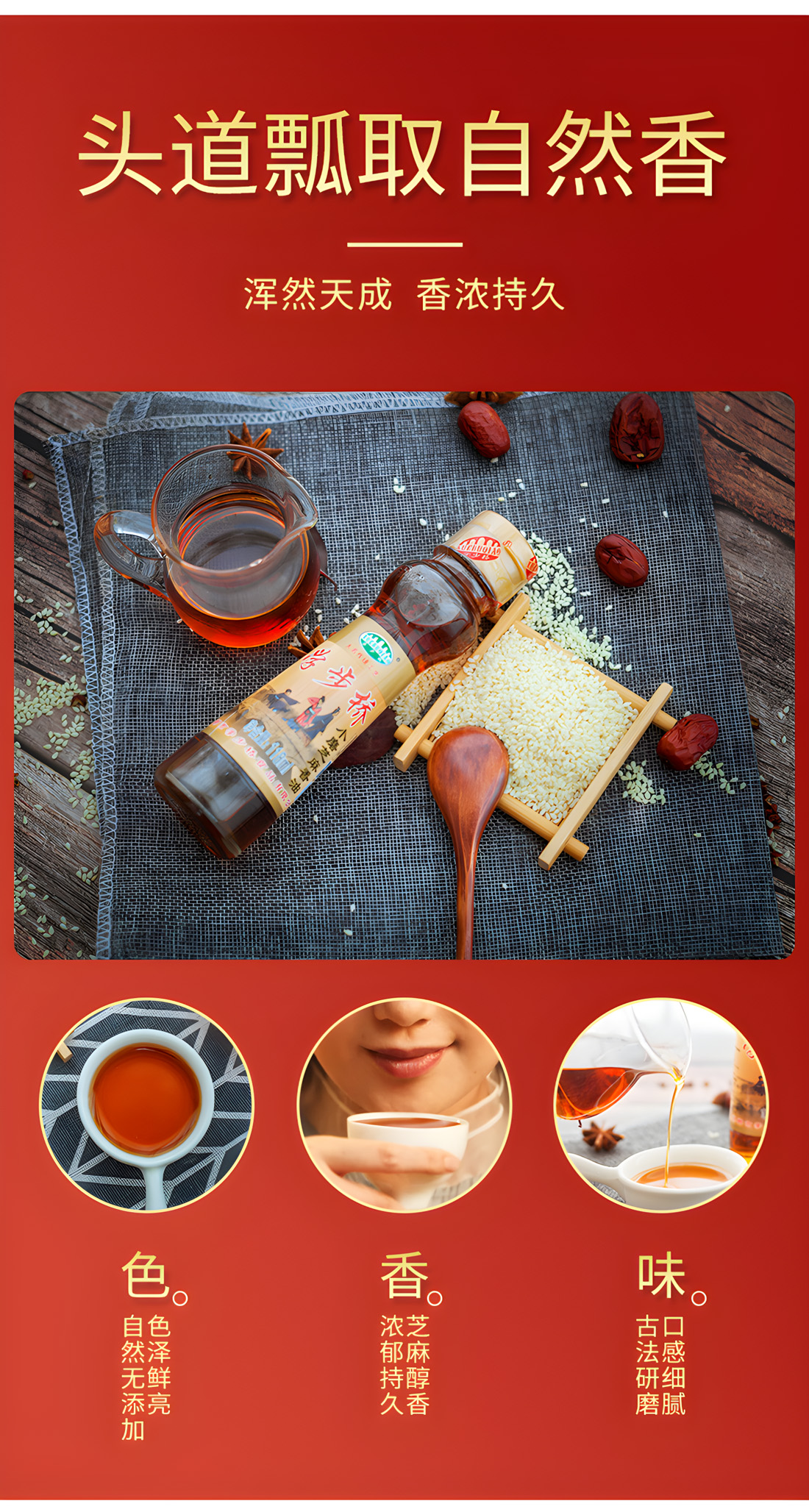 選用優(yōu)質(zhì)芝麻為原料,傳統(tǒng)石磨工藝,匠心研磨,磨出滴滴好香油。精致小瓶包裝,適合小家庭自用,調(diào)餡、涼拌菜、做湯,烹煮煎炸燒,樣樣在行!