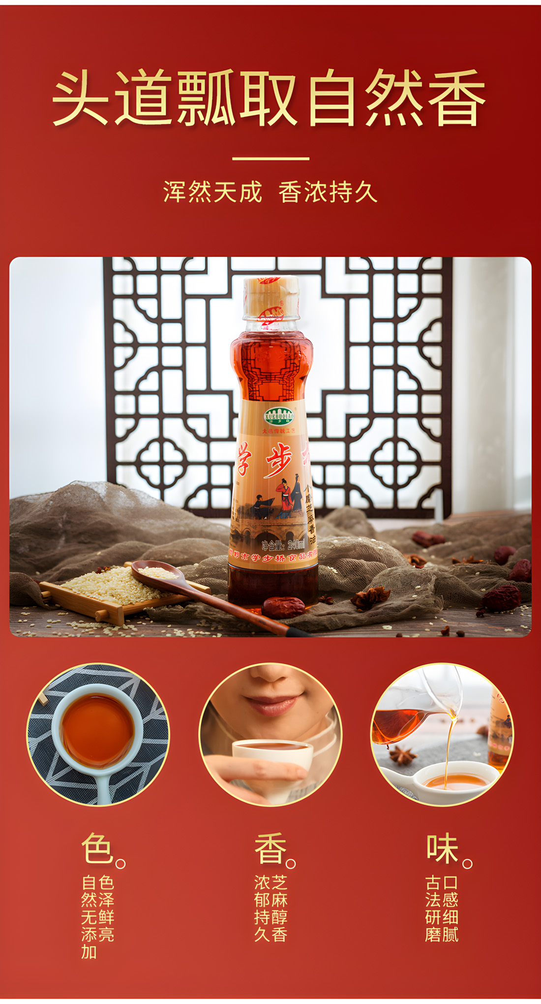 選用優(yōu)質(zhì)芝麻為原料,傳統(tǒng)石磨工藝,匠心研磨,磨出滴滴好香油。精致小瓶包裝,適合小家庭自用,調(diào)餡、涼拌菜、做湯,烹煮煎炸燒,樣樣在行!