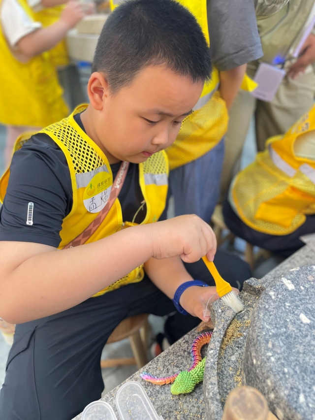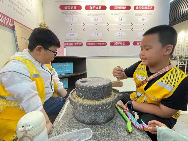 最讓孩子們?nèi)杠S的,當(dāng)屬親手轉(zhuǎn)動古法石磨!工作人員提前將炒至金黃的芝麻備好,小探索家們兩兩一組,握住木質(zhì)磨桿,在“嘿喲嘿喲”的號子聲中合力推動。隨著石磨緩緩轉(zhuǎn)動,芝麻粒在磨盤間歡快地跳舞,不一會兒就變成了金黃油潤的芝麻碎,散發(fā)出陣陣濃郁的香氣。孩子們抹著額頭的汗珠,捧著自己親手研磨的芝麻碎,眼中滿是新奇與自豪,臉上洋溢著欣喜和滿足的笑容。