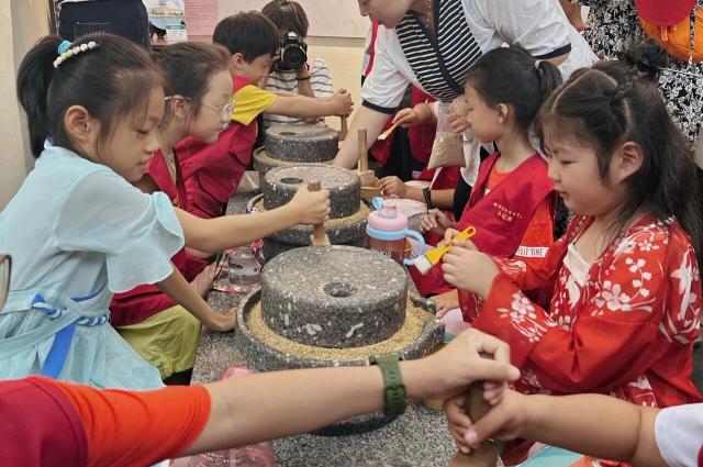 最讓小記者們興奮的是工藝體驗環(huán)節(jié)。在傳統(tǒng)石磨區(qū),大家分組圍站在古樸的石磨旁,挽起袖子輪流嘗試推磨?!昂贸裂?!”第一次推磨的小記者有些吃力,但在小伙伴的合力幫助下,石磨慢慢轉(zhuǎn)動起來,磨盤間逐漸滲出細膩金黃的芝麻碎。
