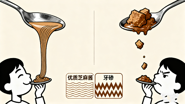 -芝麻醬:純芝麻制作的呈淡黃色或棕黃色,色澤鮮亮柔和是優(yōu)質(zhì)品。若顏色發(fā)灰、暗沉,或出現(xiàn)明顯顆粒感,可能是原料劣質(zhì)或研磨不細(xì)。用勺子舀起時(shí),好醬會(huì)呈線狀流暢流下,含油充足;塊狀落下的則質(zhì)地粗糙,品質(zhì)欠佳。