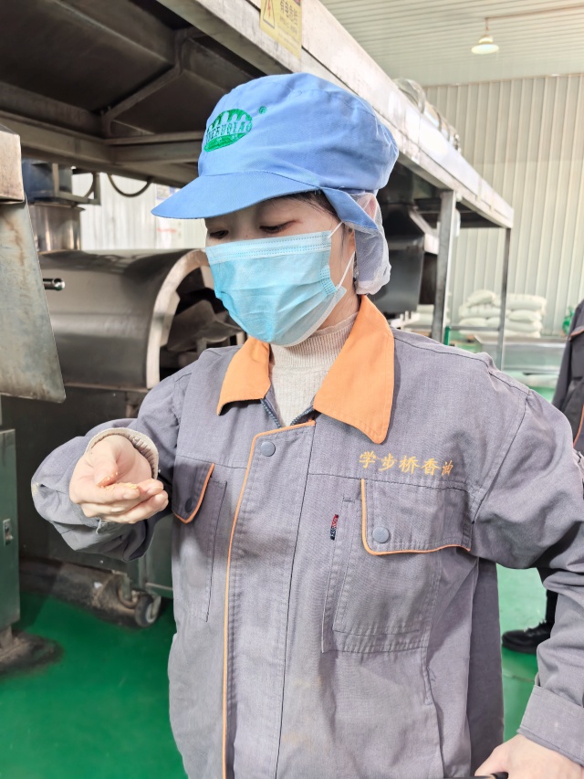 抱著這份純粹之心,王小英重新出發(fā)。她聽(tīng)取主任的建議,琢磨搬抬的巧勁,避免蠻干傷身體;她把近萬(wàn)斤的目標(biāo)拆解,從每天800斤洗芝麻、800斤上料開(kāi)始,讓身體慢慢適應(yīng);她在漂洗時(shí)仔細(xì)觀察芝麻的狀態(tài),把瑣碎的清理工作當(dāng)成磨練耐心的修行。今年11月初,她順利通過(guò)了技工認(rèn)證的最后一項(xiàng)考核,成為了學(xué)步橋小磨香油發(fā)展史上的第一位女技工。