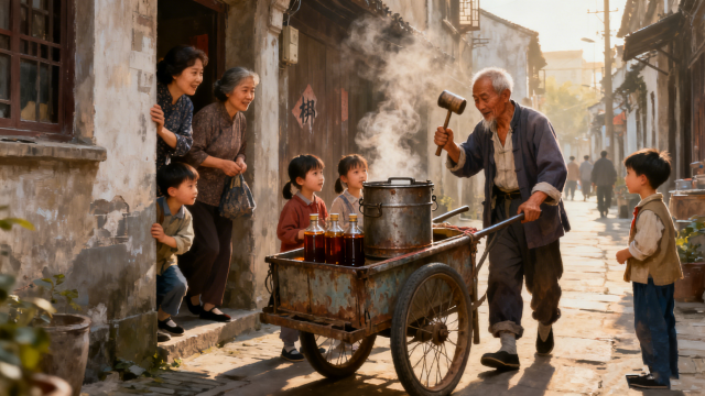 那時(shí)候的香油沒有花哨的品牌,它的“廣告”是走街串巷的油梆子聲?!鞍稹稹?,清脆的敲擊聲穿透清晨的薄霧,掠過巷口的老槐樹,像一句無(wú)聲的召喚,總能讓巷子里的主婦們紛紛探出頭來(lái)。賣香油的老漢推著一輛舊手推車,車上有個(gè)鐵質(zhì)的黑乎乎的香油桶,當(dāng)香油桶的蓋子打開時(shí),一股濃郁的芝麻香便爭(zhēng)先恐后地涌出來(lái),瞬間彌漫整條街巷。孩子們會(huì)圍著香油車打轉(zhuǎn),眼神里滿是好奇與渴望,那香氣像有魔力,勾得人直咽口水。