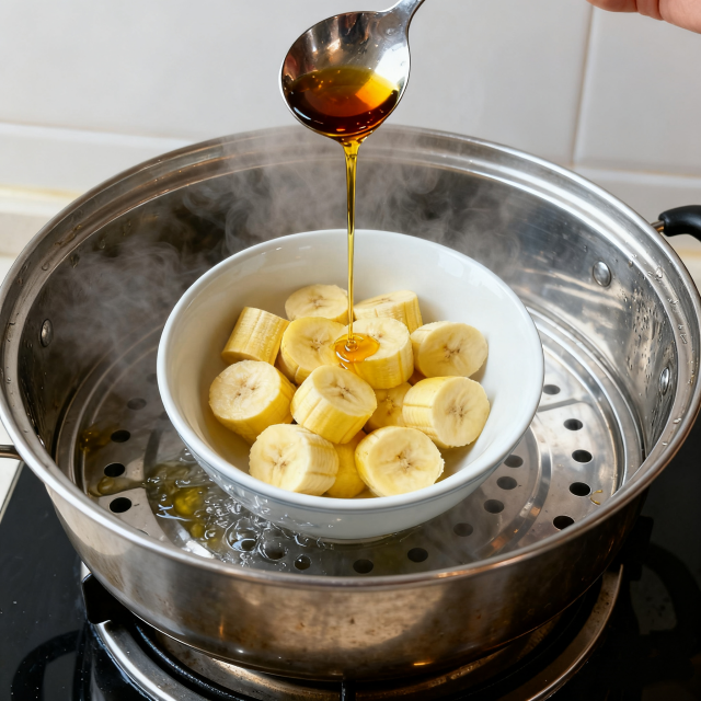2.向碗中的香蕉段淋上 1 勺學(xué)步橋小磨香油,然后將碗放入蒸鍋,待蒸鍋水燒開后,用中火蒸 8 分鐘;