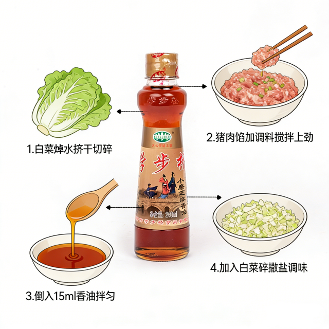 【食材準備】豬肉餡500g、白菜400g、蔥姜末適量、生抽2勺、老抽半勺、蠔油1勺、鹽適量、學步橋小磨香油黃金比例:500g豬肉餡 + 15ml香油