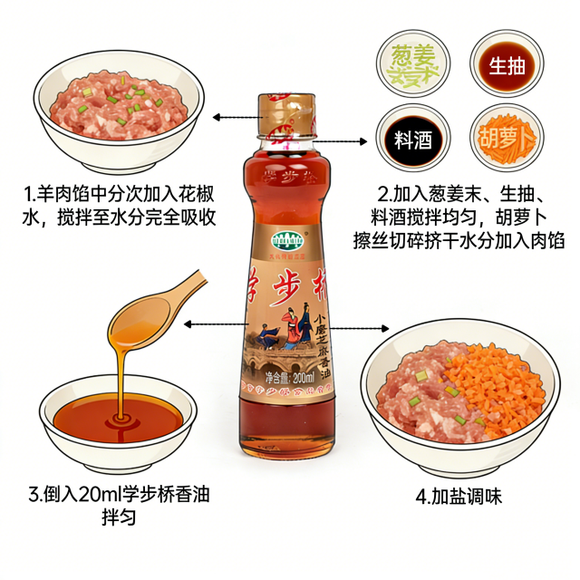 【食材準備】羊肉餡500g、胡蘿卜2根、花椒水適量、蔥姜末適量、生抽2勺、料酒1勺、鹽適量、學步橋小磨香油黃金香油比例:500g羊肉餡 + 20ml香油