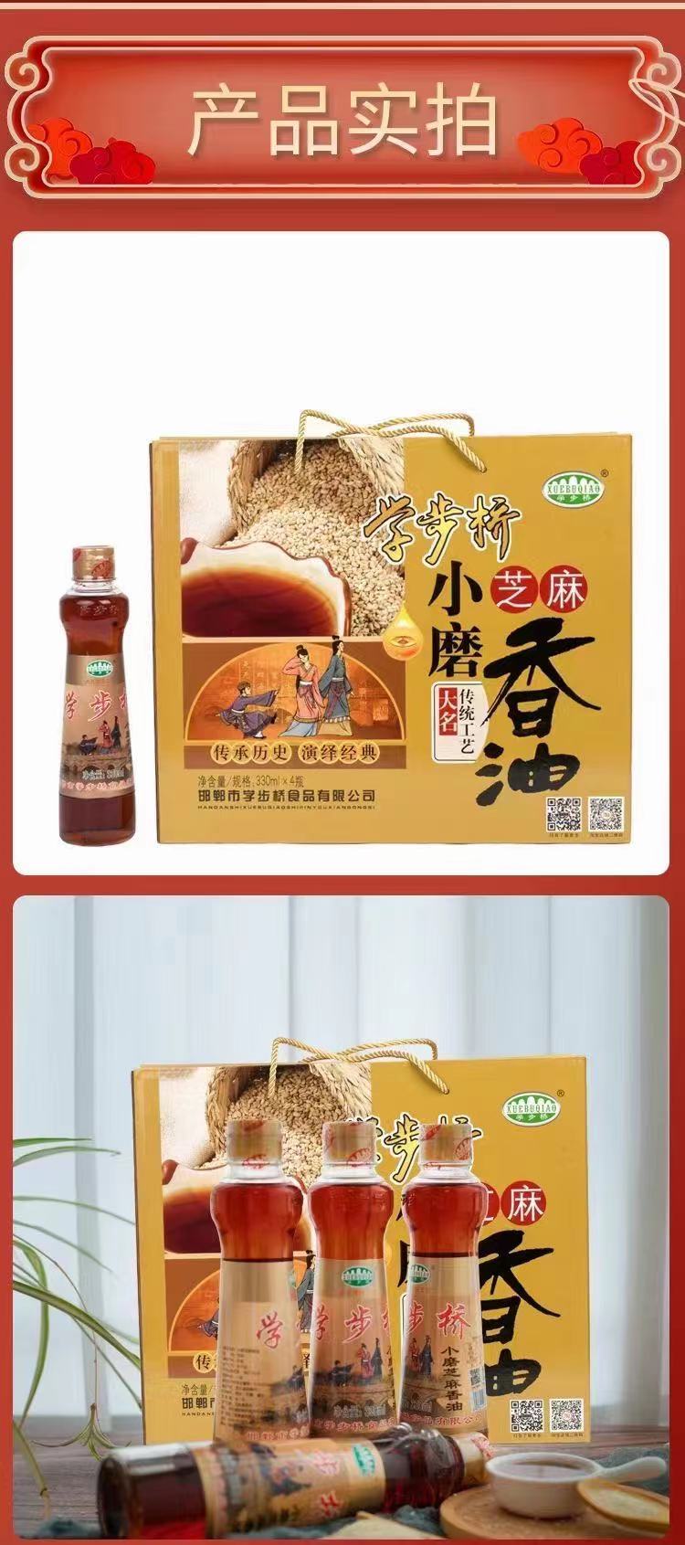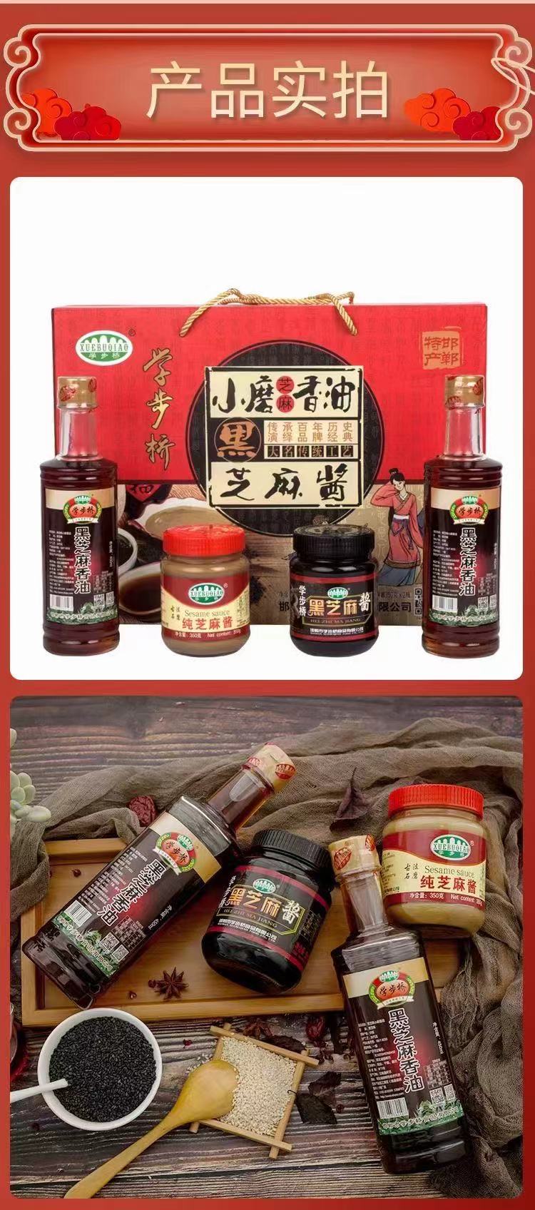 小磨香油禮盒240mlX2瓶;小磨香油禮盒240mlX4瓶;小磨香油禮盒450mlX2瓶;小磨香油禮盒330mlX4瓶;黑芝麻香油禮盒 450mlX2瓶;黑芝麻香油禮盒240mlX4瓶;黑芝麻香油禮盒450mlX4瓶;芝麻醬禮盒350克X4瓶;芝麻醬套裝禮品
